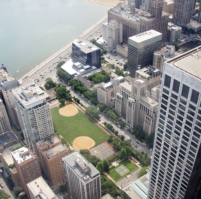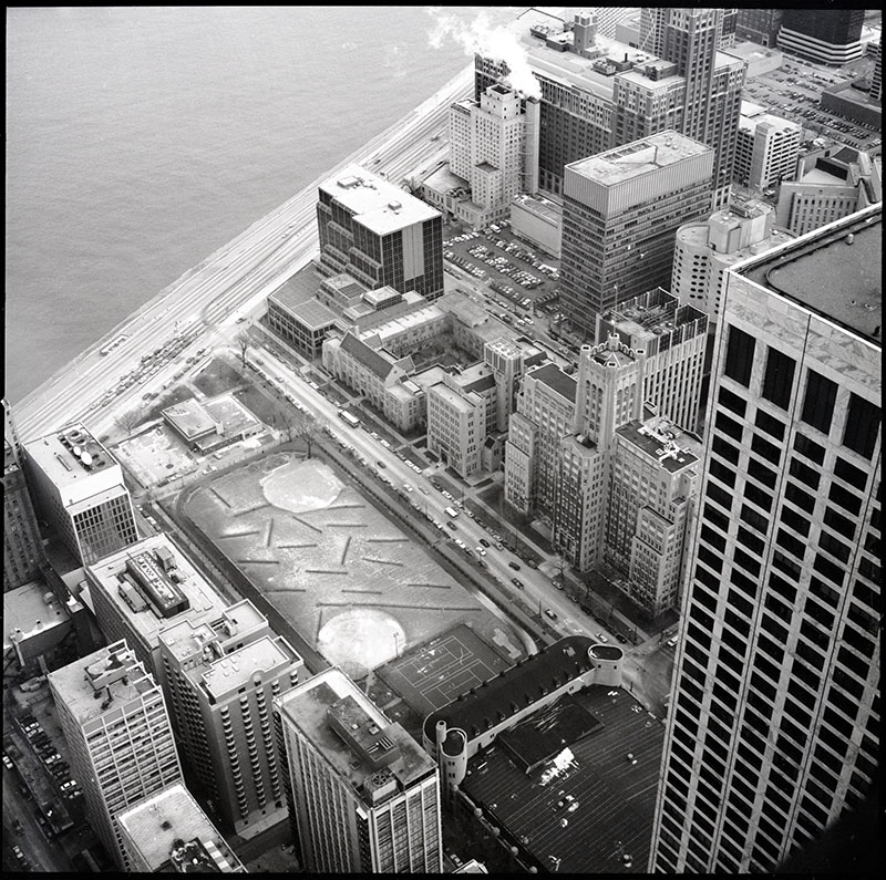 ![]() In December 1986 I went up to the John Hancock Observatory and photographed from multiple viewpoints. I found the negatives while researching for Shifting Grounds and discovered that I had captured a view showing the east end of the armory, along with the Chicago Park District's Lake Shore Park. I returned in August 2013 to photograph from the same perspective. The image at the left shows how the MCA occupied half of the armory building's footprint. See an animated comparison, here. In May 1990, MCA officials signed a $99/99 year lease. In my conversation with Mary Ittelson, the MCA's first associated director who came on board in 1988, she talked about how staff members gave single dollars in commemoration of and acknowledgement for individual years. Once the lease had been signed, progress continued toward occupying the armory site. By the following May, after a yearlong search for an architect, the architectural search committee chose Josef Paul Kleihues. In March 1992, at the museum's 25th year anniversary gala, plans for the new museum were unveiled. And in September, before work toward removing the armory building began, associate curator of exhibitions Beryl R. Wright put together a landmark exhibition within the building that stood on those grounds for over 70 years. Art in the Armory: Occupied Territory became the armory building's swan song as invited artists installed work within and in response to the building's architecture and history. During the six months of March through August 1993, workers slowly demolished the stone fortress. First removing the middle arena section - the first addition that was constructed in 1925 - the flanking remains represented the original (1917) eastern builidng and the final (1940) portions of the hulking structure. In December 1993, the MCA held its ceremonial groundbreaking, and by the following April the building was under construction. In a year's time the outside of building was complete, and in two more years the museum opened with a 24-hour summer solstice celebration. In the capital campaign to raise $55 million dollars for the new museum, the 51 members of the board of trustees contributed a staggering $37 million. In the end the museum raised more than $72 million. |