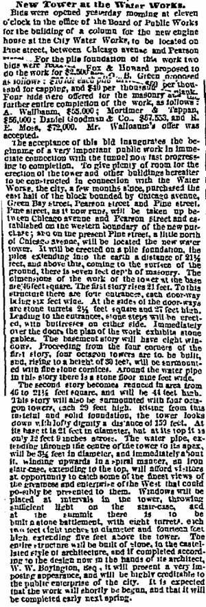 The first flow of pure lake water through the pipes and hydrants of the city, will be accompanied by the laying of the corner stone of the new Water Works Building, and will be the occasion of a grand procession. The stone will be laid by the Grand Master of the Grand Lodge of Illinois A.F.&A.M., after which an oration will be delivered by his honor Mayor Rice. |