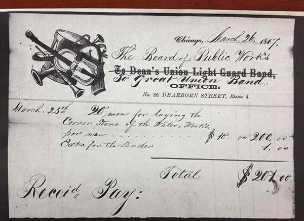 March 26, 1867: copy of the twenty-member Great Union Band's receipt for their performance at the laying of the Water Works corner stone. They charged one dollar extra for the Leader. |