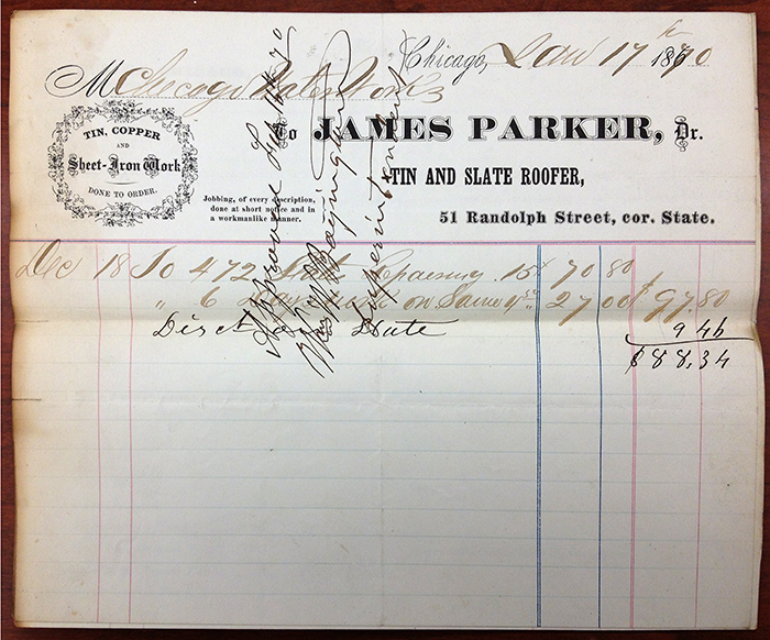Designed by William W. Boyington and completed in 1869, the Water Tower's corner stone was laid two years earlier as the culmination of a grand parade, as described to the right. A January 1870 receipt, signed by Boyington is presented courtesy of the Chicago History Museum.