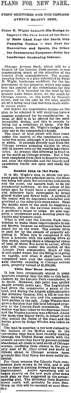 Chicago Tribune, April 14, 1950 ![]() According to this April 14, 1950 Chicago Tribune article, there were three proposed underground parking sites: "1) An area east of the Oak st.-Michigan intersection and between the inner and outer lanes of Lake Shore dr.; one level for 625 to 925 cars; 2) The Lake Shore playground bounded by Pearson st., Lake Shore dr., Chicago av., and the east end of the 122nd field artillery armory; two levels for 1,520 cars; and 3) The area bounded by Chicago, Pearson, Seneca st. and the east side of the Chicago av. pumping station; two levels for 639 cars." |