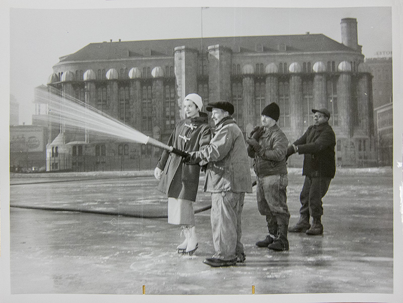 ![]() By permission and courtesy of the Chicago Park District Special Collections. These 1939 photographs from the Chicago Park District Special Collection shows workmen and their helpers flooding Lake Shore Park to make an ice rink. The picture, above, shows a clear view of the original Chicago Avenue Armory facade. The armory's architecture would change with a 1940 addition. |