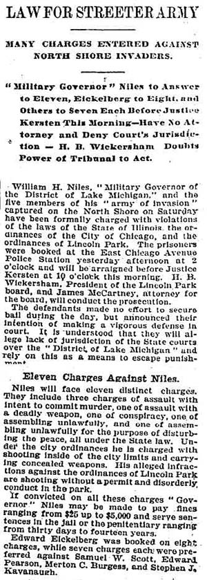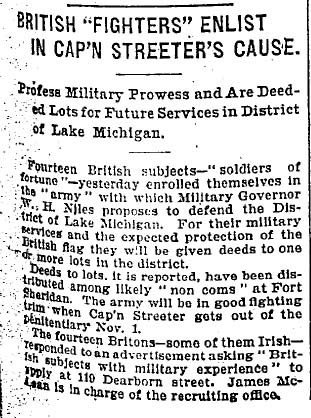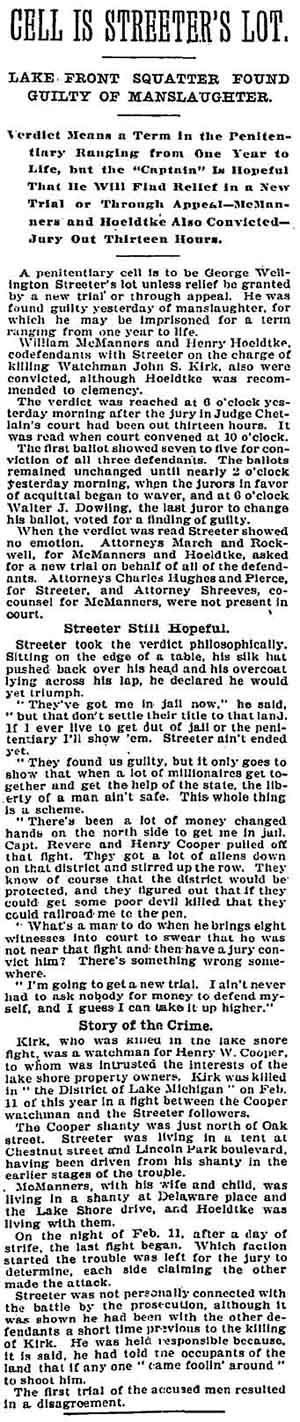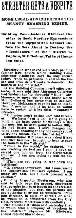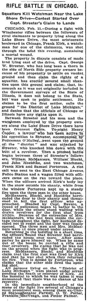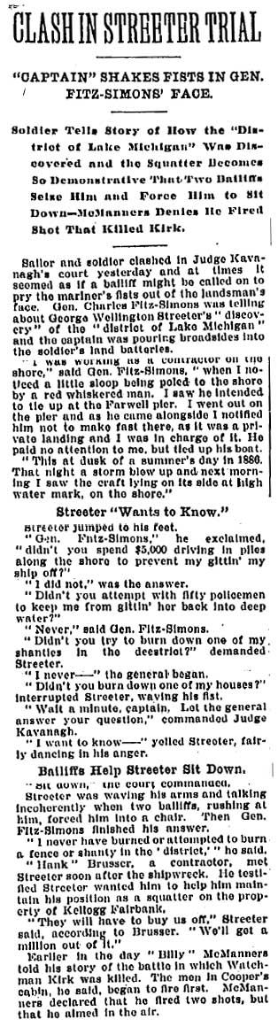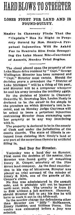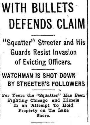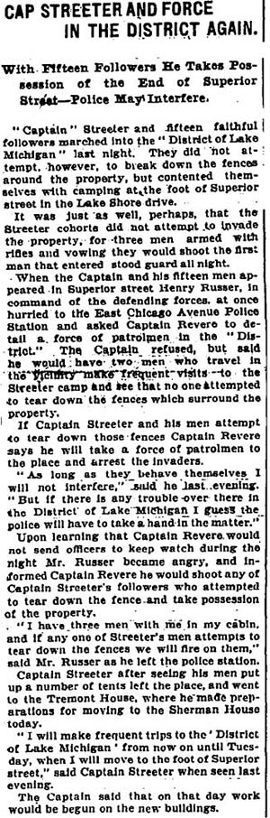 Chicago Daily Tribune, January 17, 1902 Within weeks of the above article's publication, Cap Streeter was back in a tangle over his fraudulent land patent with President Grover Cleveland's forged signature. See A Creative But Fraudulent Claim. |
