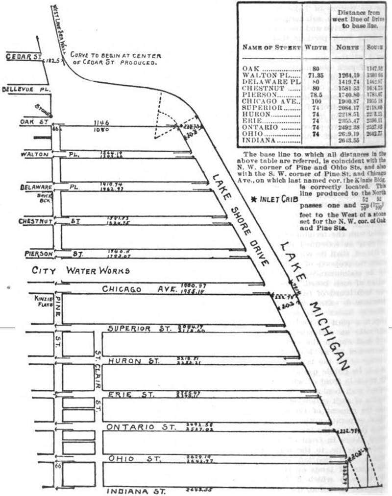 Section 4: “Upon completion of any such extension of such boulevard or driveway, the title thereto, and to the bed thereof, shall be vested in such board of park commissioners, for the purpose of a boulevard or driveway and shall become a part of the public park or parks under the control of such board, and shall thenceforth be maintained and controlled by such board in the manner provided by law for the government and maintenance of other boulevards and driveways under its control.” Under this act of the legislature, the board of commissioners of Lincoln Park located its boulevard or driveway over upon Lake Michigan in such a manner that 93 acres of submerged land lying between the shore and the western boundary of the driveway were reclaimed. This large tract of reclaimed land was, under the provisions of the act, sold by the board of commissioners to the shore owners, each shore owner obtaining that portion of the reclaimed land lying opposite the tract of land by him owned. In consideration of the sale of these lands, the shore owners agreed to construct the driveway in the lake, and fill in the submerged lands between the driveway and the shore, except the commissioners agreed to build so much of the driveway as should lie north of the center line of Oak street extended, and to have the same completed by the 1st day of May, 1893; also, to build the boulevard or driveway between the center line of Pearsons street and the center line of Chicago avenue. In addition to the work agreed to be done by the shore owners, they also agreed to pay the commissioners $100 per lineal foot of their respective frontages on Lake Michigan. The following plat, put in evidence on the trial, shows the location of the boulevard and the lands lying east of Pine street, made by its construction [see above]